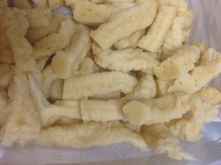 スパッツェルは焼くとフンワリとして、カリカリとふわふわが美味しいですが、焼く前はニョッキみたいになってます。
